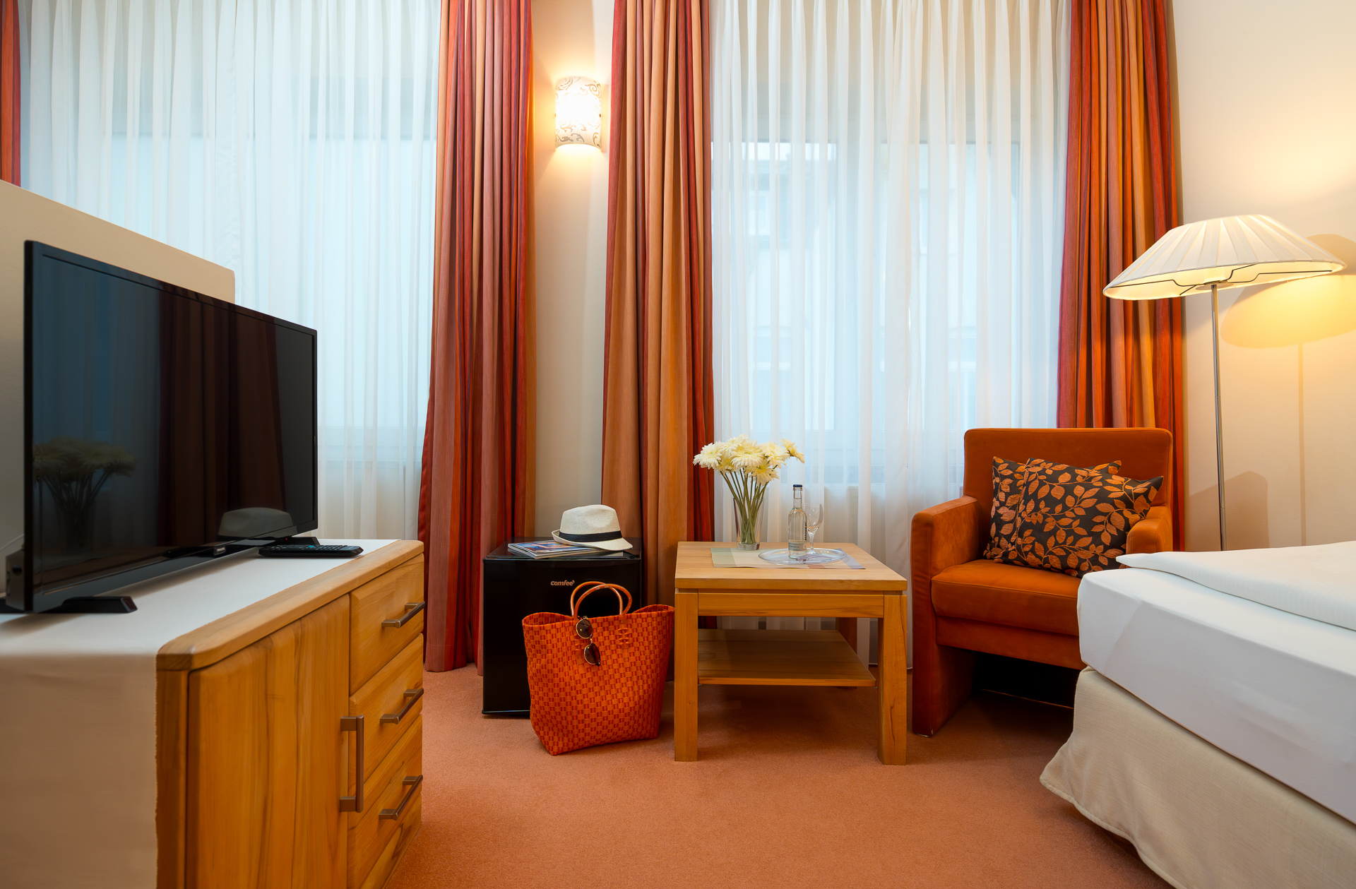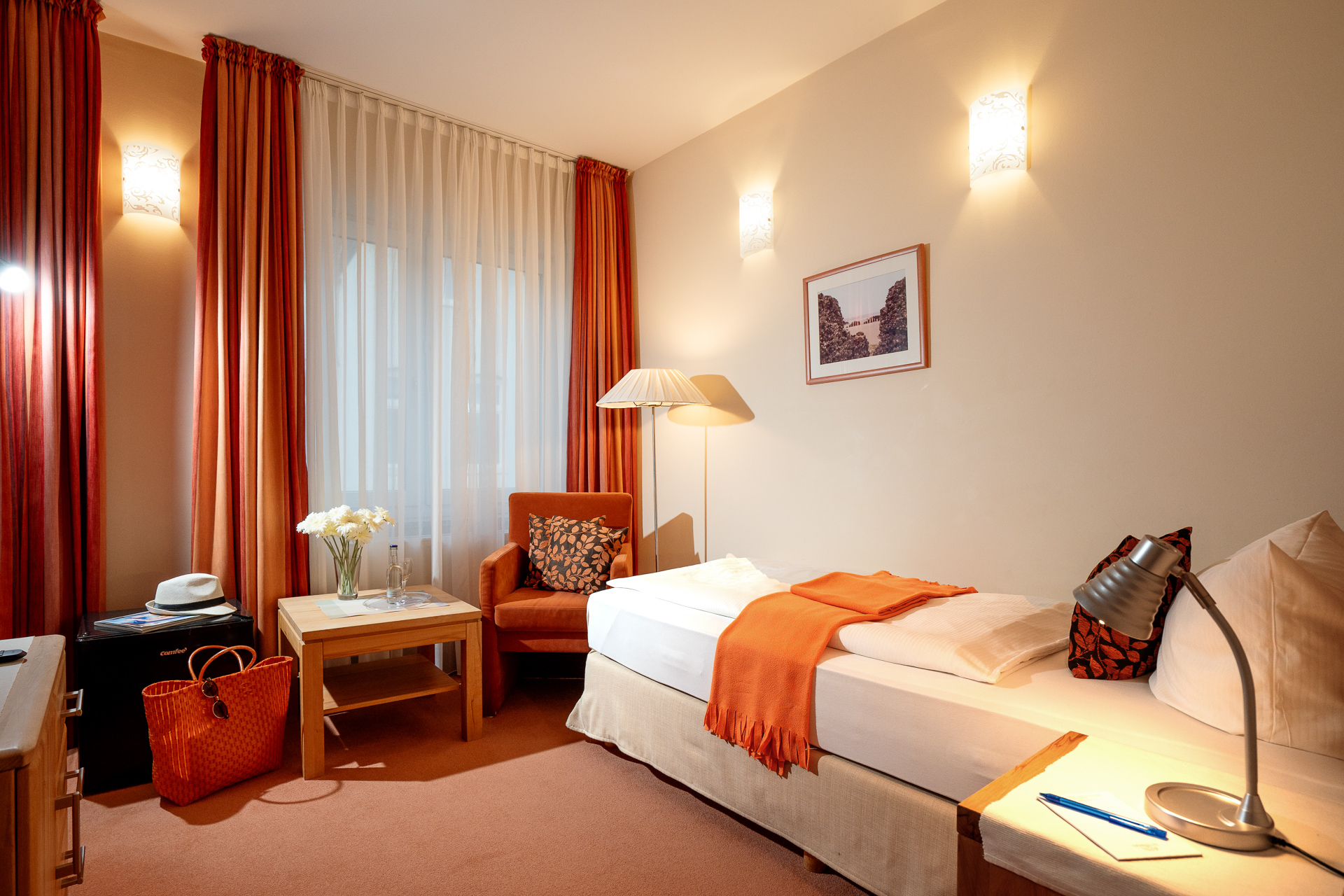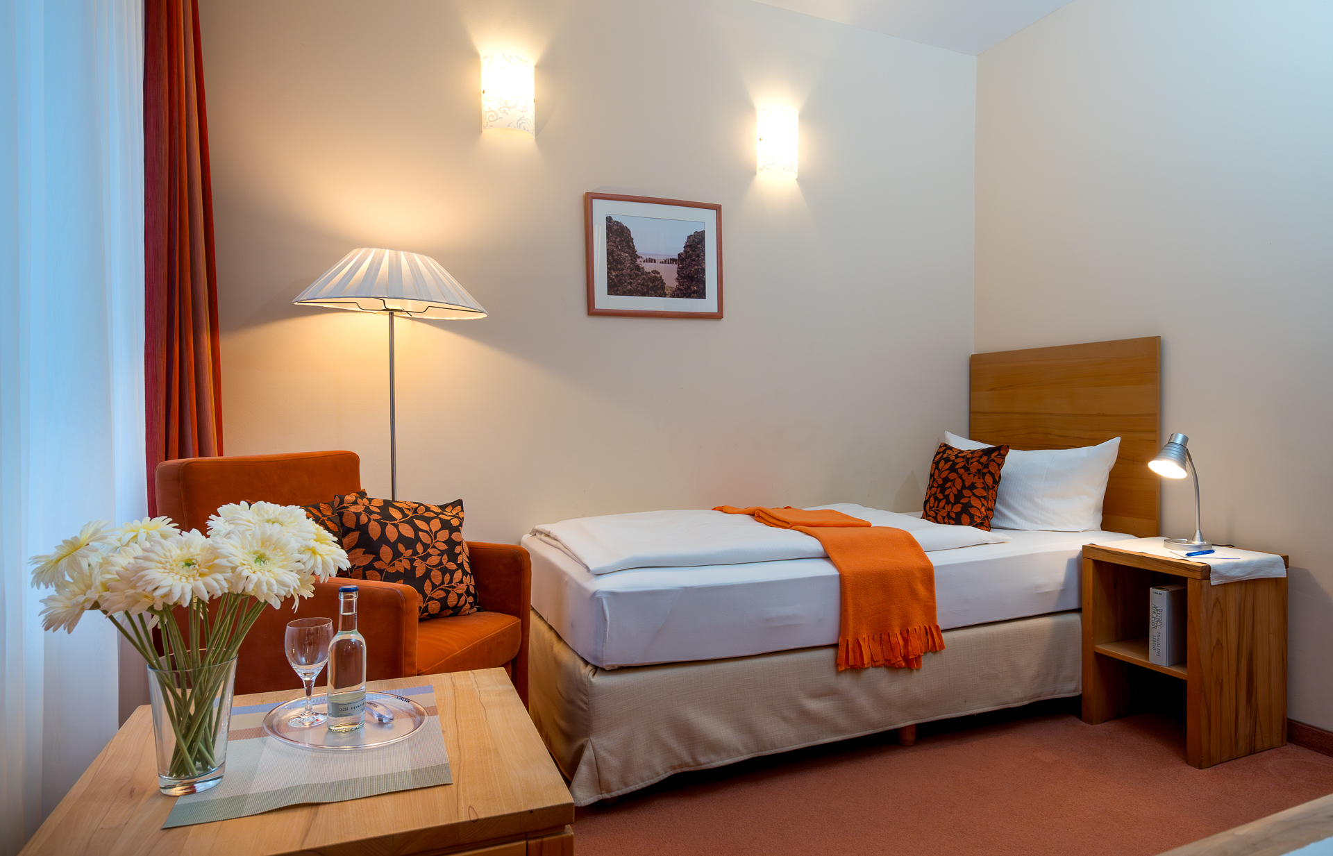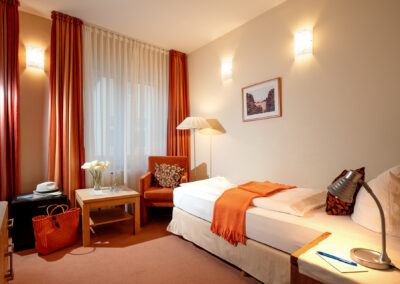 Alle Einzelzimmer haben eine neutrale, klassische Einrichtung, in der sich jeder sofort wohlfühlt. Zu den Einrichtungs-Highlights gehören neben den gemütlichen Einzelbetten ein Flachbild-Kabelfernseher, bequeme Sitzmöglichkeiten sowie ein kleiner Tisch, an dem es sich prima arbeiten oder Ansichtskarten schreiben lässt. Ein eigenes Duschbad mit Haartrockner und kostenlosen Pflegeprodukten ist selbstverständlich. Unsere Einzelzimmer sind unterschiedlich geschnitten. Bei den Fotos handelt es sich um Beispielbilder, die vom tatsächlich gebuchten Zimmer abweichen können. In der Saison beträgt die Mindestbuchungsdauer an Wochenenden zwei Tage, an Feiertagen drei Tage.