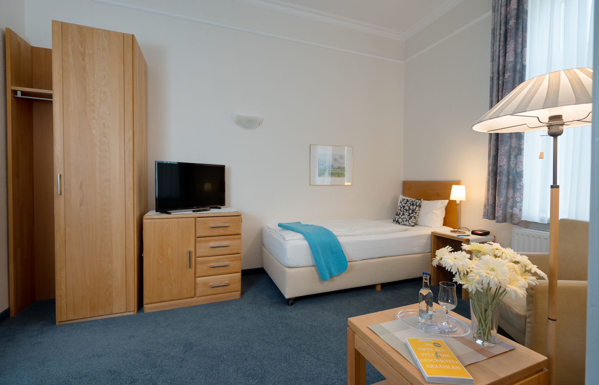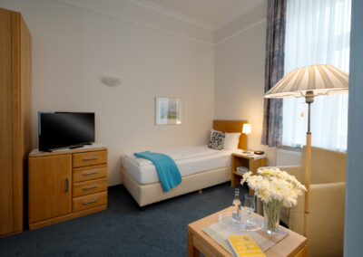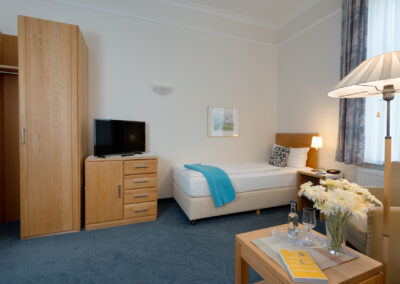 Alle Einzelzimmer haben eine neutrale, klassische Einrichtung, in der sich jeder sofort wohlfühlt. Zu den Einrichtungs-Highlights gehören neben den gemütlichen Einzelbetten ein Flachbild-Kabelfernseher, bequeme Sitzmöglichkeiten sowie ein kleiner Tisch, an dem es sich prima arbeiten oder Ansichtskarten schreiben lässt. Ein eigenes Duschbad mit Haartrockner und kostenlosen Pflegeprodukten ist selbstverständlich. Unsere Einzelzimmer sind unterschiedlich geschnitten. Bei den Fotos handelt es sich um Beispielbilder, die vom tatsächlich gebuchten Zimmer abweichen können. In der Saison beträgt die Mindestbuchungsdauer an Wochenenden zwei Tage, an Feiertagen drei Tage.